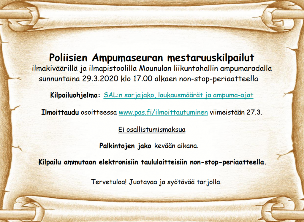 « Kaikki Tapahtumat Tämä tapahtuma on mennyt. PERUTTU – PAS-ilma-asemestaruuskilpailut 29.3.2020 @ 17:00 - 21:00 « PERUTTU – Kevätkokous PERUTTU – Pienoiskiväärin jatkokurssi » PERUTTU – PAS-ilma-asemestaruuskilpailut Lisää kalenteriin Google Calendar iCalendar Outlook 365 Outlook Live Tiedot Päivämäärä: 29.3.2020 Aika: 17:00 - 21:00 Tapahtumapaikka Maunulan liikuntahalli